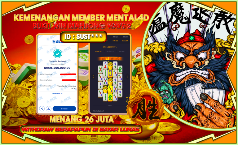 MENTAL4D – BANDAR SLOT GACOR PASTI MEMBAYAR KEMENANGAN MEMBER HINGGA LUNAS Selamat kepada user id : SUSY*** telah berhasil mendapatkan kemenangan besar pada permainan SLOT MAHJONG WAYS 2  sejumlah Rp 51,100,000,- Setelah mengisi formulir withdraw dengan kurung waktu 3-5 menit pihak MENTAL4D langsung melakukan transfer kepada pemilik user id dan dana sudah dapat di cairkan…